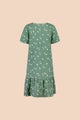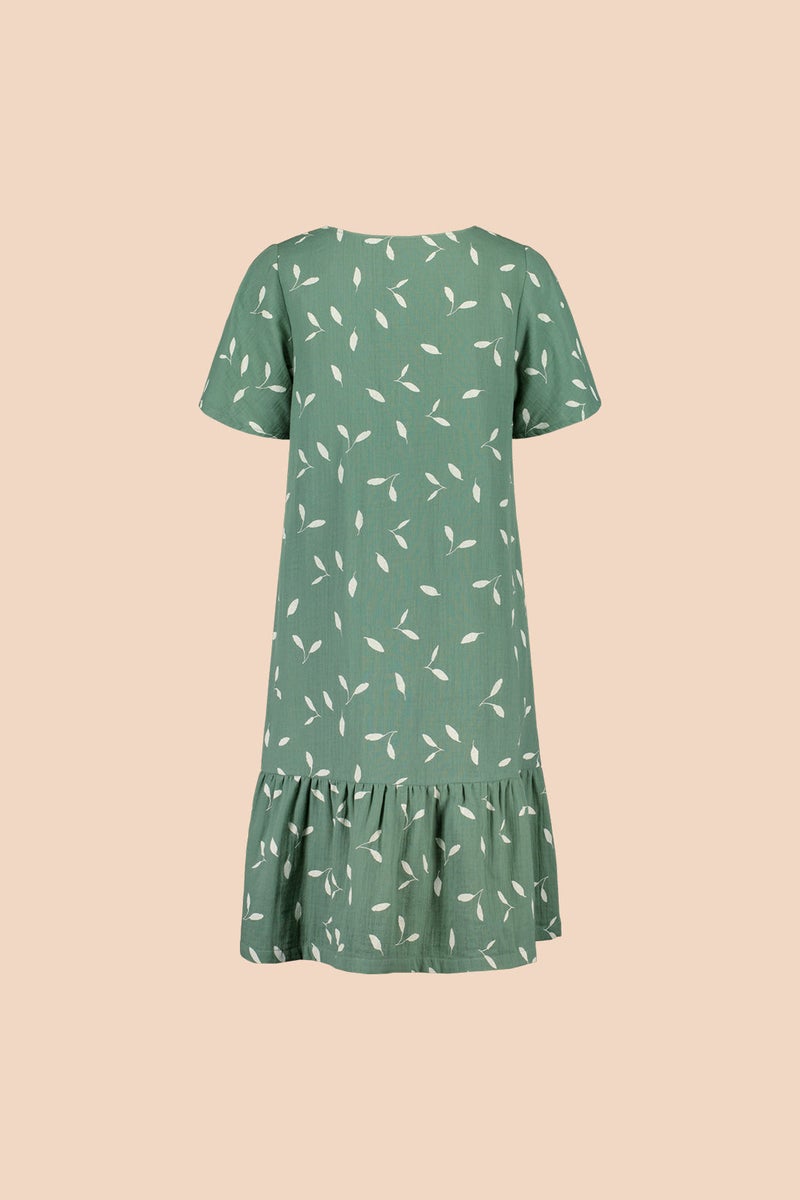 Vastuullisesti valmistetussa mekossa on väljä istuvuus, v-pääntie, kevyesti kellotetut hihat ja keskellä edessä kulkee nappirivi. Helmaa koristaa poimutettu frilla. Frillan korkeus 25 cm. Helman pituus noin polvimittainen. Kuosina Sage Wind, jonka murretun vihreää pohjaa koristavat minimalistiset lehtikuviot.