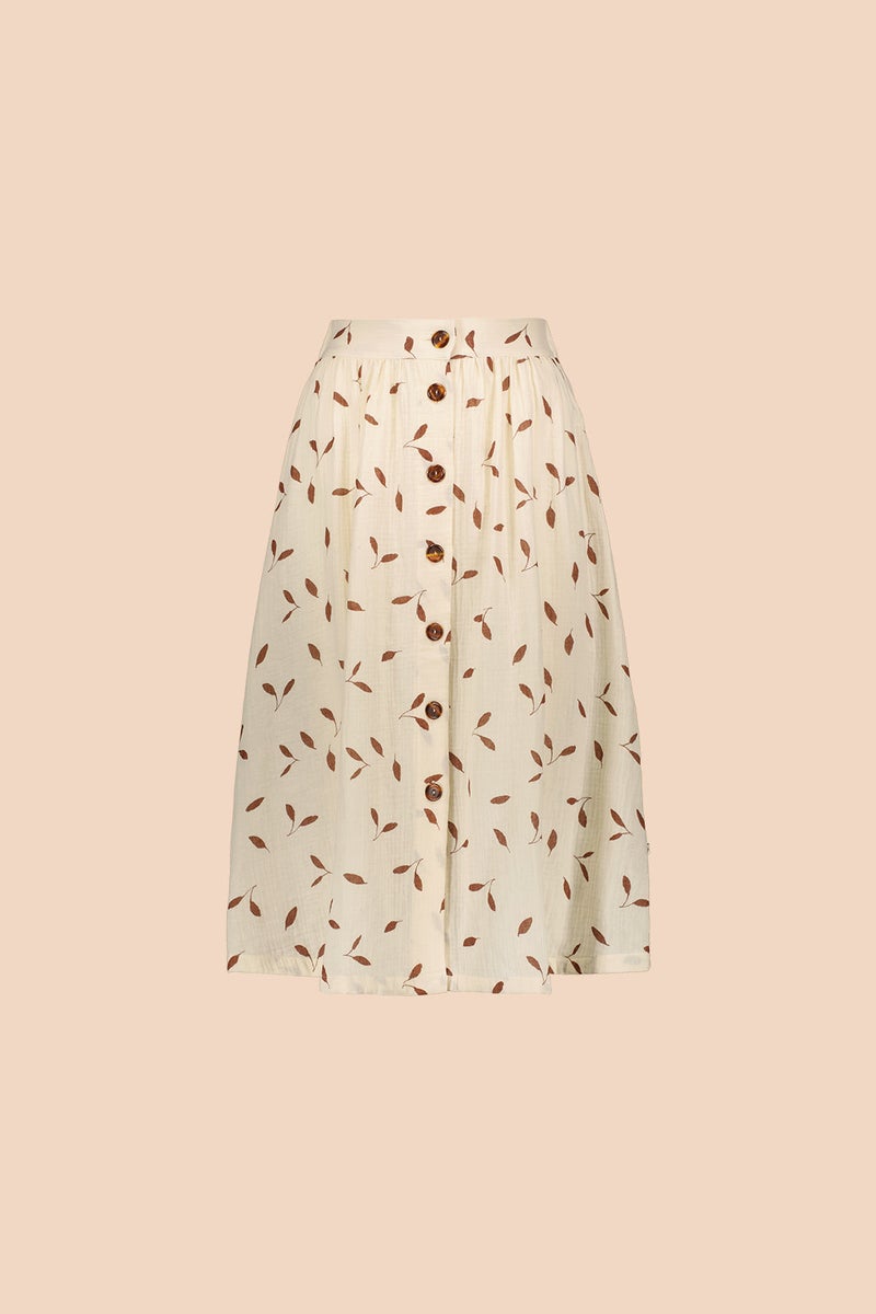 Huolettoman tyylikäs Button Skirt ihastuttaa ajattomalla designilla. Kudotusta luomupuuvillamusliinista valmistettua kauniisti laskeutuvaa midimittaista hametta koristaa nappirivi. Takana vyötäröllä kuminauha, joka tekee hameesta mukavan päällä. Ei vuoria. Nappihametta koristaa herkkä ja minimalistinen Wind -kuosi, jossa mahonginruskeat lehdet kieppuvat vaalealla pohjalla.