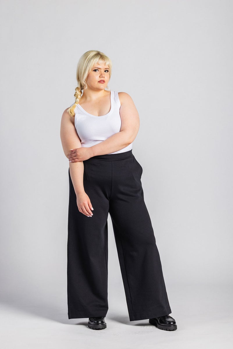 Korkea vyötärö ja kevyesti levenevät lahkeet tuovat modernia ilmettä, kun taas taskut ja kuminauha vyötärön takaosassa varmistavat käytännöllisyyden. Rentoudestaan huolimatta housujen skarppi leikkaus tekee niistä täydellisen valinnan niin toimistolle, kaupungille kuin kotipäivään.