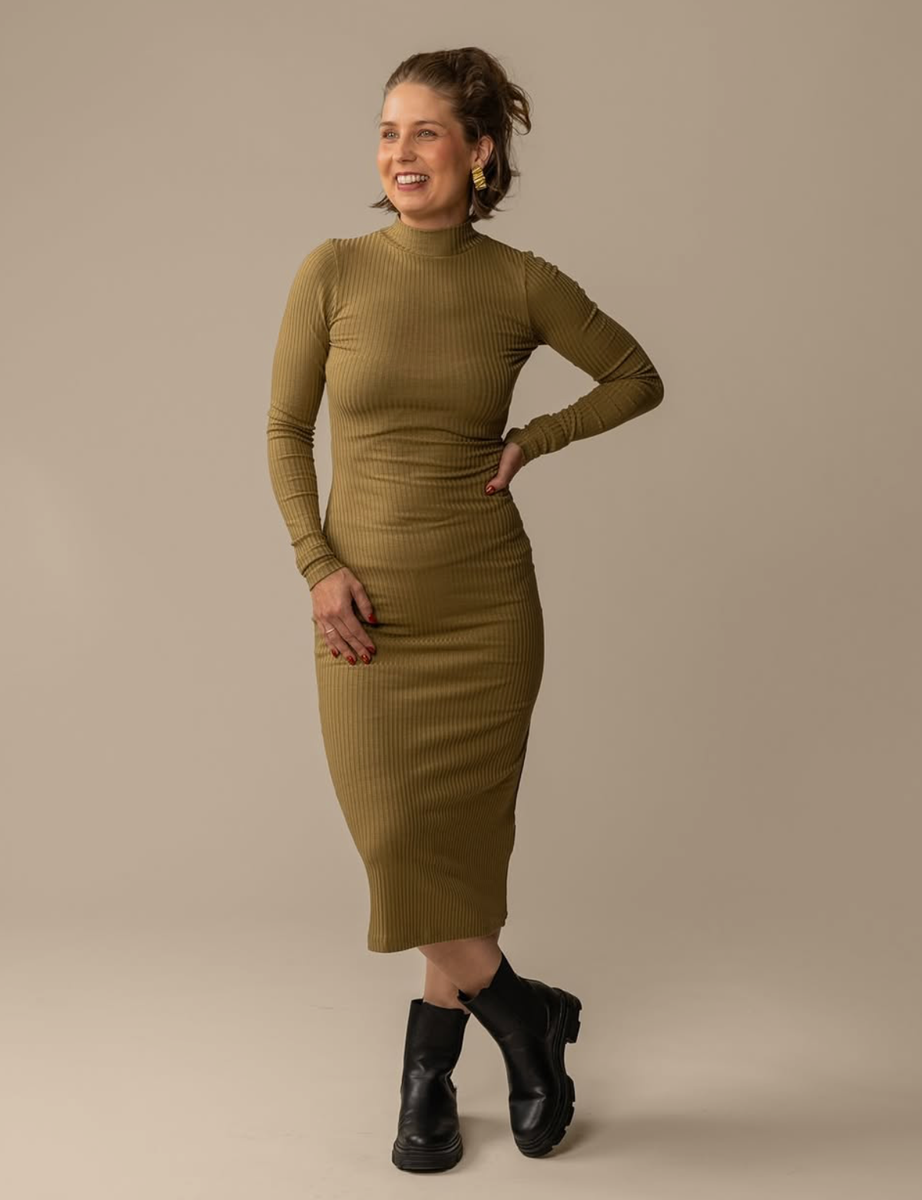 Vartalonmyötäinen, joustavasta ribbistä valmistettu ribbimekko. Mekossa on kilpikonnakaulus ja pitkät hihat.