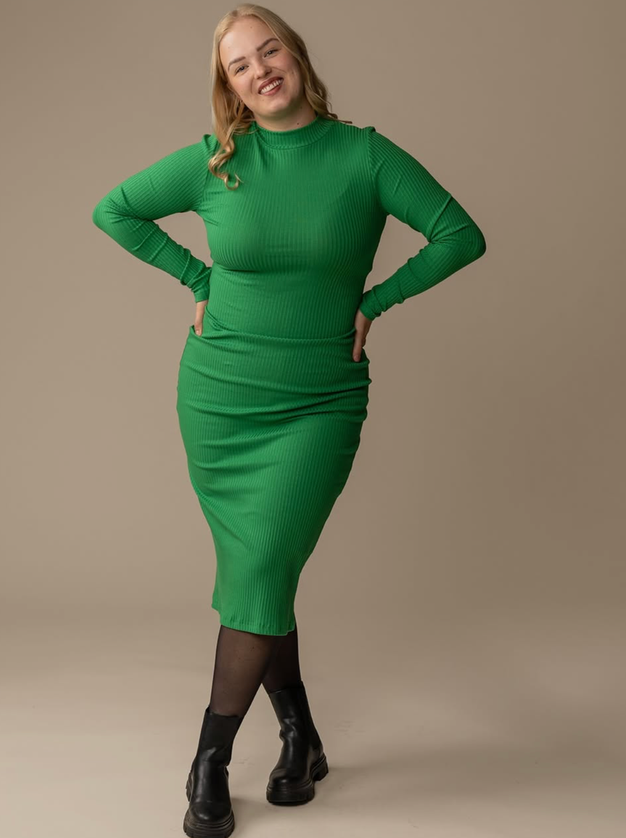 Vartalonmyötäinen, joustavasta ribbistä valmistettu ribbimekko. Mekossa on kilpikonnakaulus ja pitkät hihat.