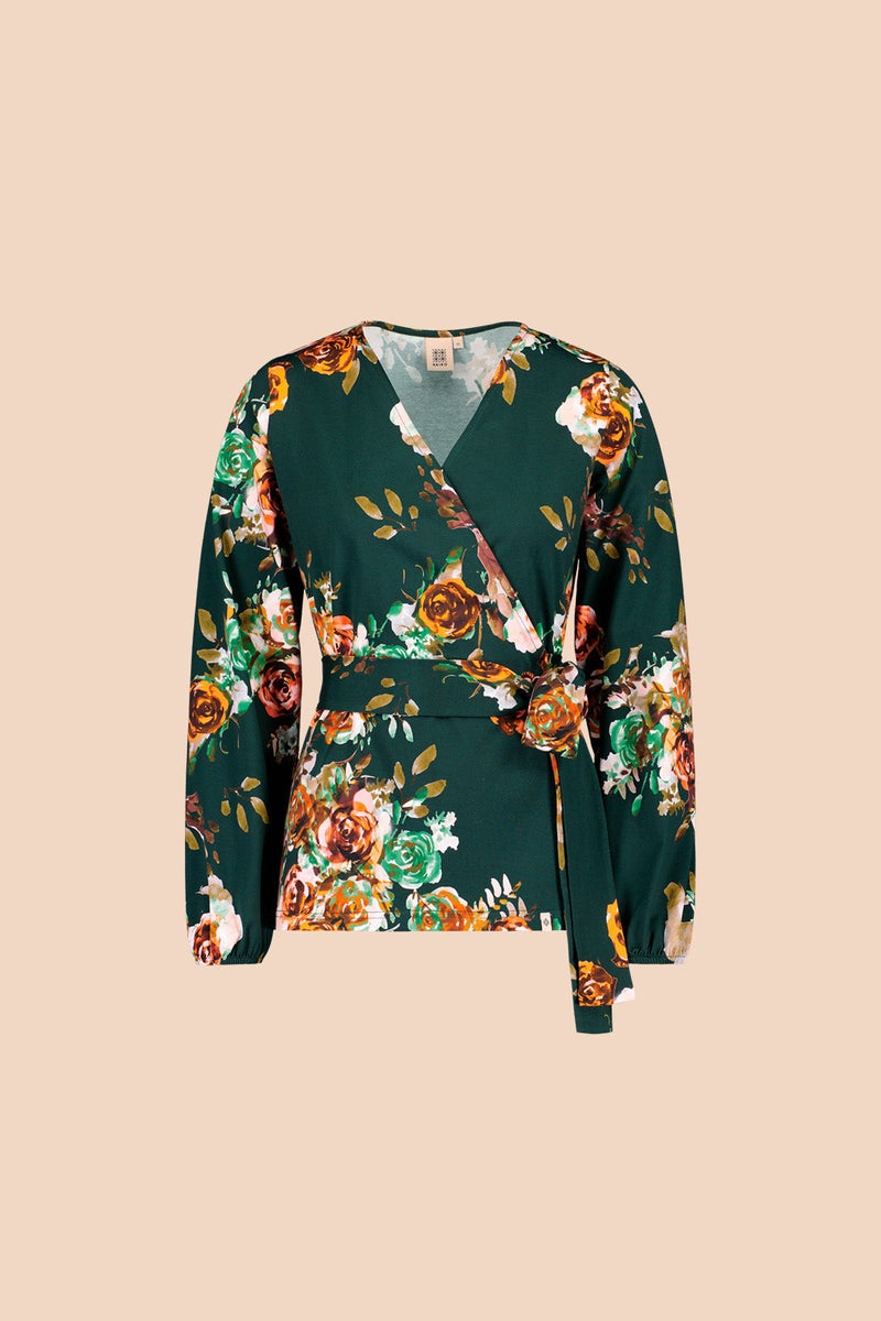 Rose Yard Green -kuosissa ruusut hehkuvat tummanvihreää taustaa vasten. Korkealaatuinen Soft Wrap Blouse -paita on suunniteltu ja valmistettu kestämään käytössä vuodesta toiseen.