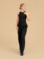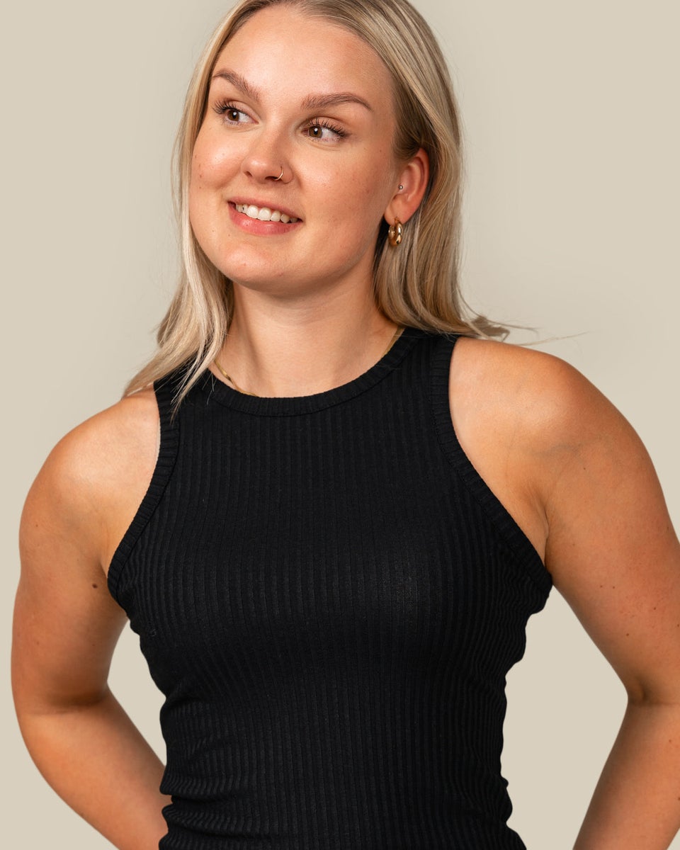 musta toppi ribbi-materiaalia. Vartalonmyötäinen istuvuus. Topin materiaali on hyvin hengittävää ja joustavaa lyocell-sekoitetta.