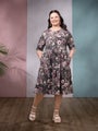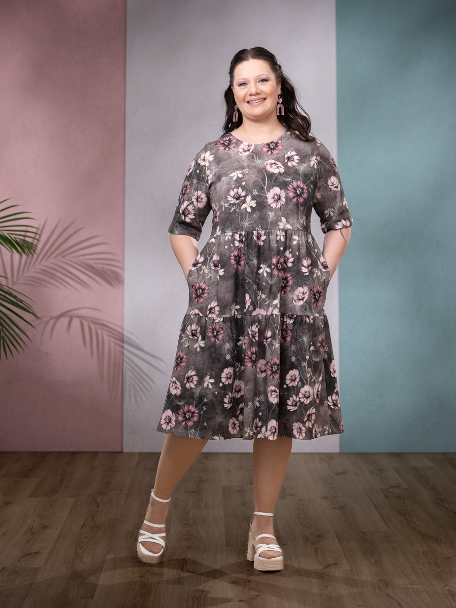 Yläosan on istuva, mekossa on kaunis o-pääntie ja lyhyet hihat. Kerrostettu, polven alapuolelle ulottuva frillahelma on kauniisti poimutettu. Sivusaumoissa on taskut.