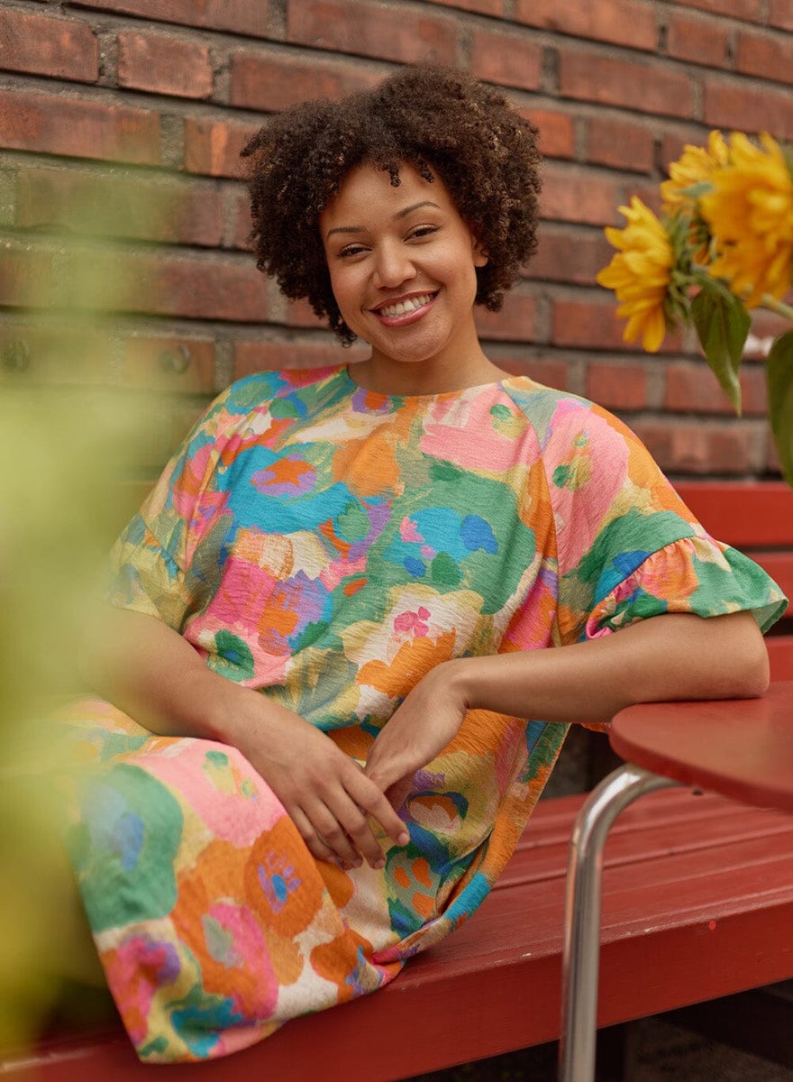 Miracles Frill Dress -Mekko värissä Spring on kevyt ja naisellinen mekko, jossa hihojen röyhelöt tuovat ilmeeseen pehmeyttä ja liikettä. Raikas kukkakuosi tekee siitä kesän luottovaatteen.