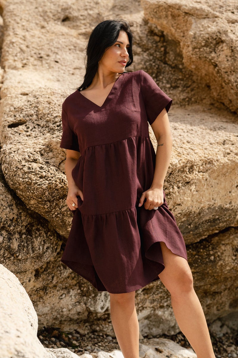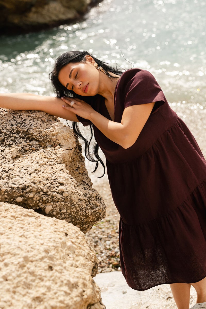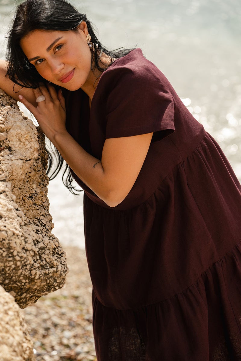 Täydellinen kesäasu syntyy cross bag -laukun sekä aurinkolasien kanssa. Syksyllä mekko sopii kauniisti neuleen ja saappaiden pariksi. Kaunis Nakoan pellavasta valmistettu kerrosmekko on täydellinen valinta niin juhlapäivään kuin leikkikentälle.
